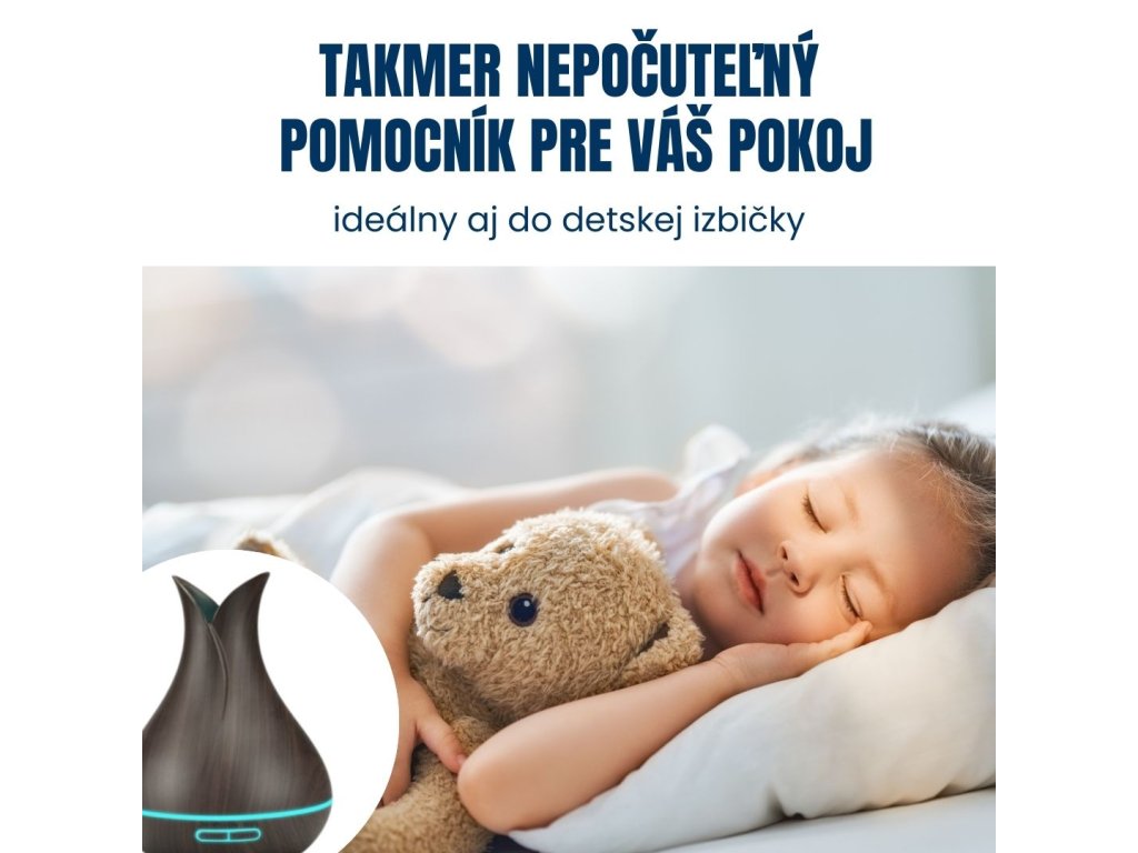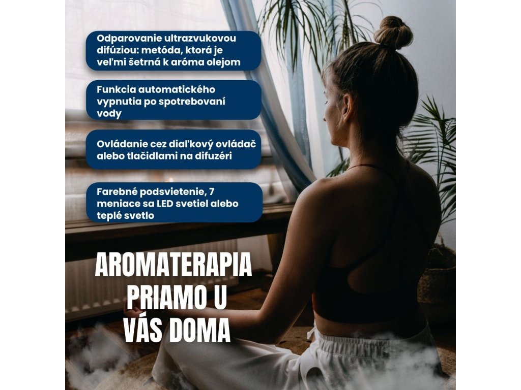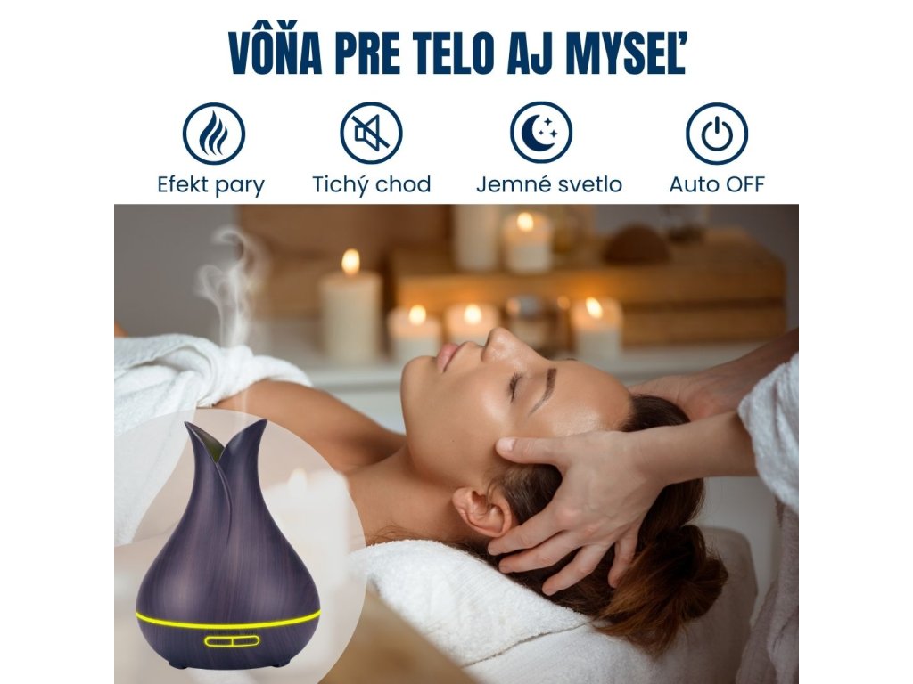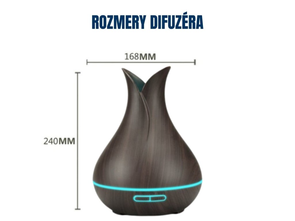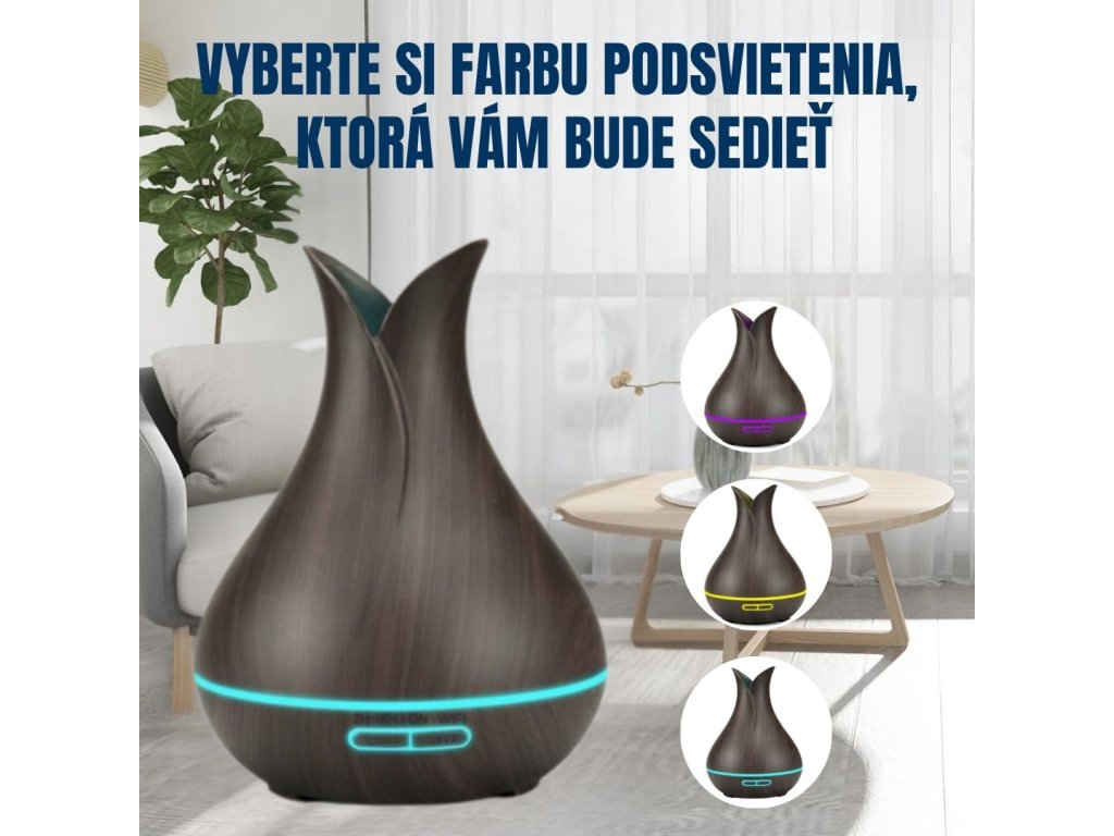 Aróma difuzér, objem nádoby 400 ml, 7 farieb podsvietenia, doba prevádzky 12 hodín, ovládanie diaľkovým ovládačom a tlačidlami na difuzér, podsvietenie a časovanie zapnutie a vypnutie, farba tmavo hnedé drevo.