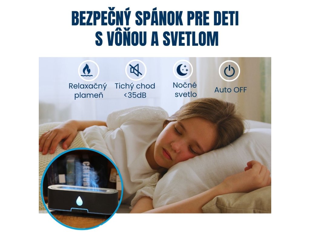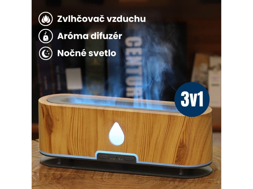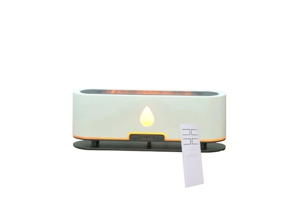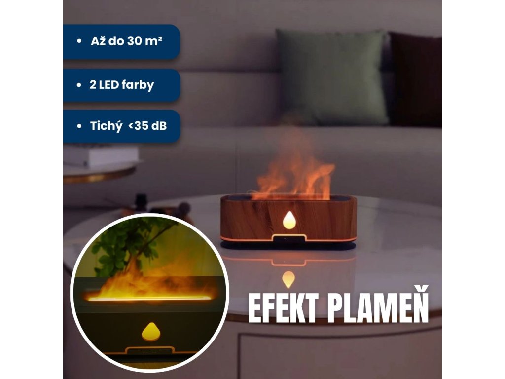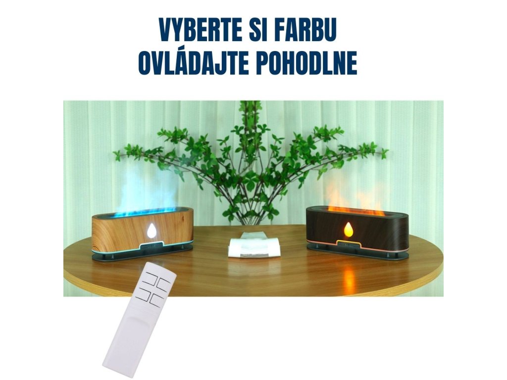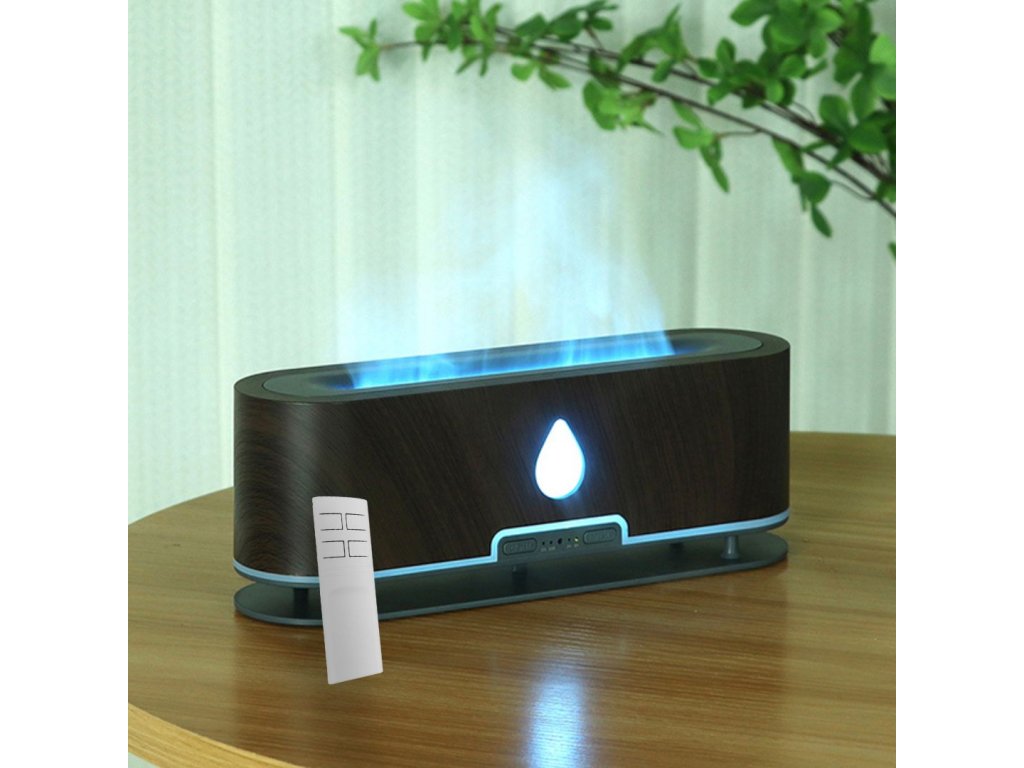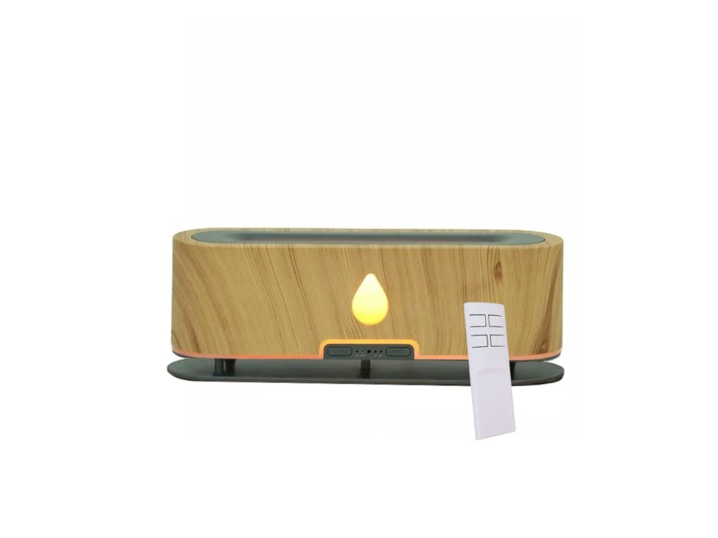 Aróma difuzér, objem nádoby 200 ml, 2 farebné podsvietenie, imitácia plameňa, doba prevádzky 12 hodín, diaľkové ovládanie, farba biela, tmavo hnedé drevo a svetlo hnedé drevo.