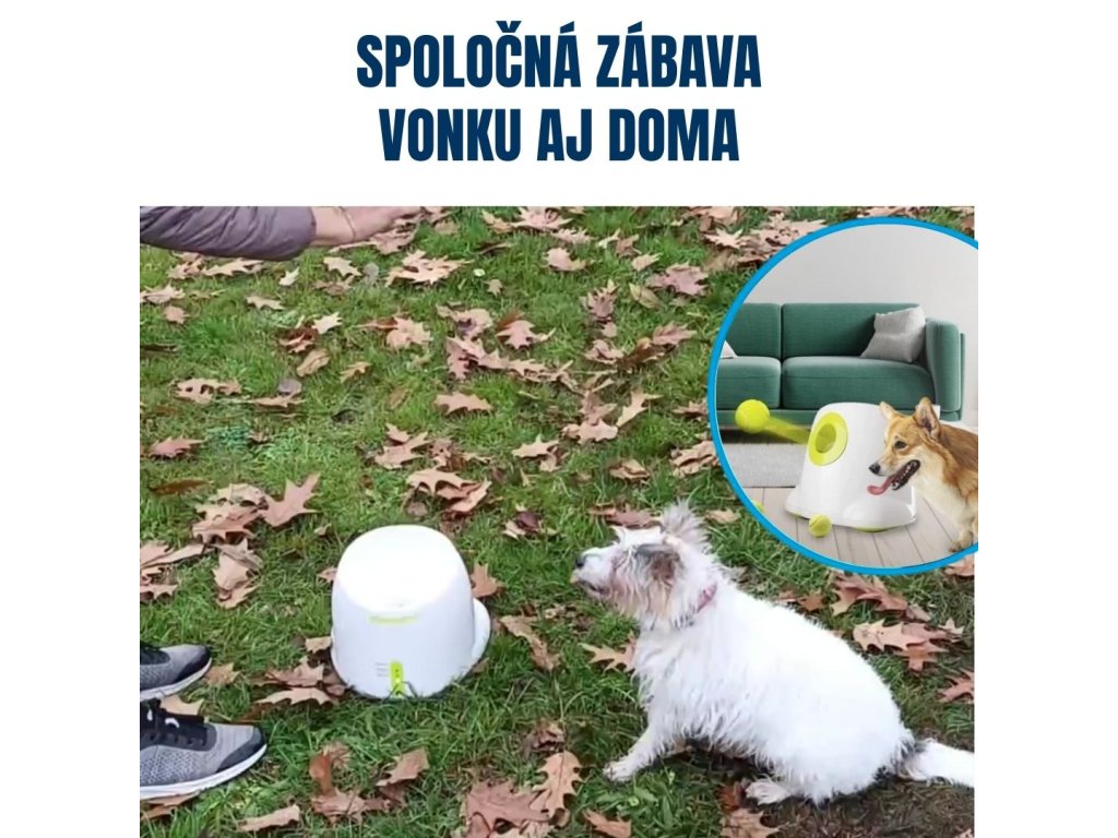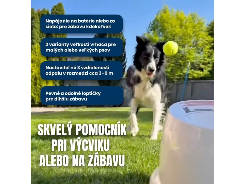 Vrhač loptičiek pre psov, dva varianty - malé loptičky (priemer 5 cm) a štandardné tenisové loptičky (priemer 6,5 cm), malé sú vhodné pre menšie a stredné plemená psov a veľké sú vhodné pre väčšie plemená psov, materiál: plast, nastavenie vzdialenosti, napájanie zo siete a na batérie, 3 loptičky v balení
