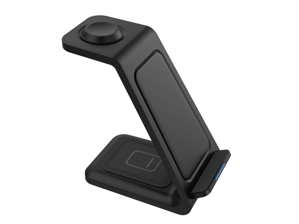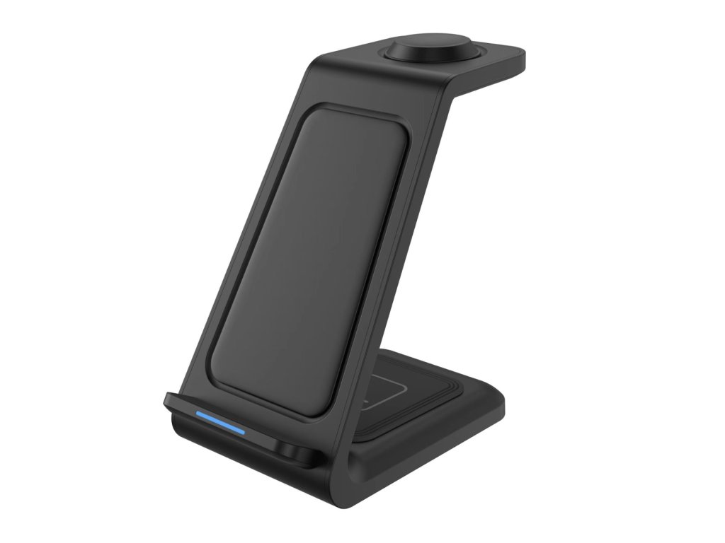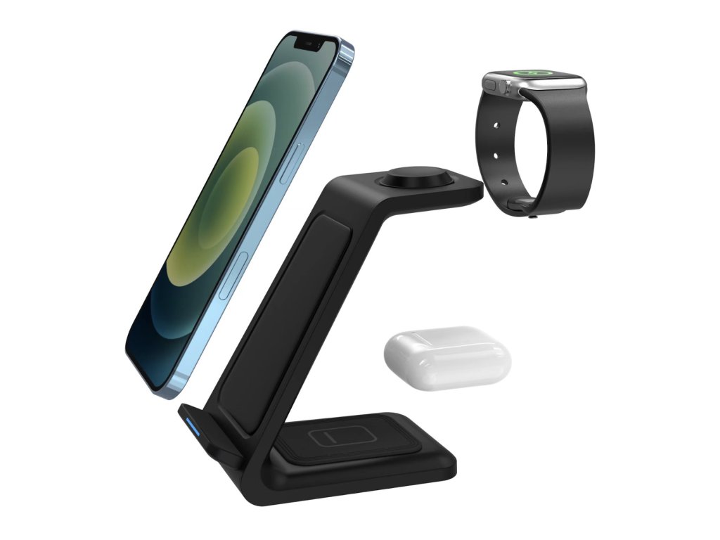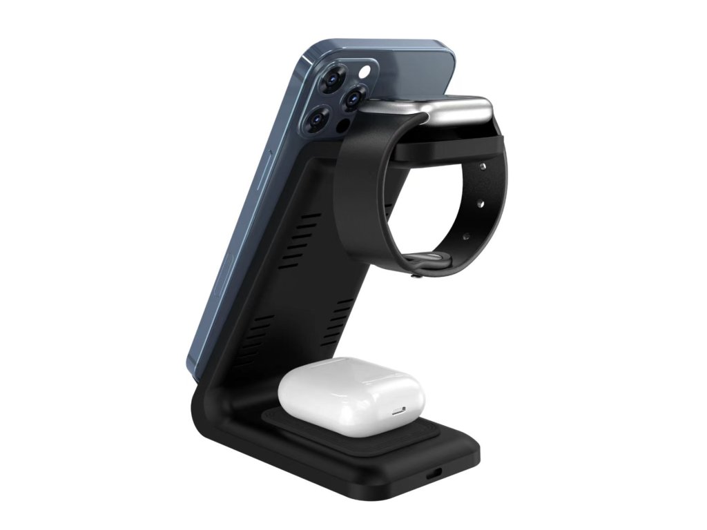 Bezdrôtová nabíjacia stanica 3v1, určená na bezdrôtové nabíjanie mobilného telefónu, hodiniek a slúchadiel, vstup USB-C, výkon 10 W, ochrana proti podpätiu a prepätiu, čierny dizajn.