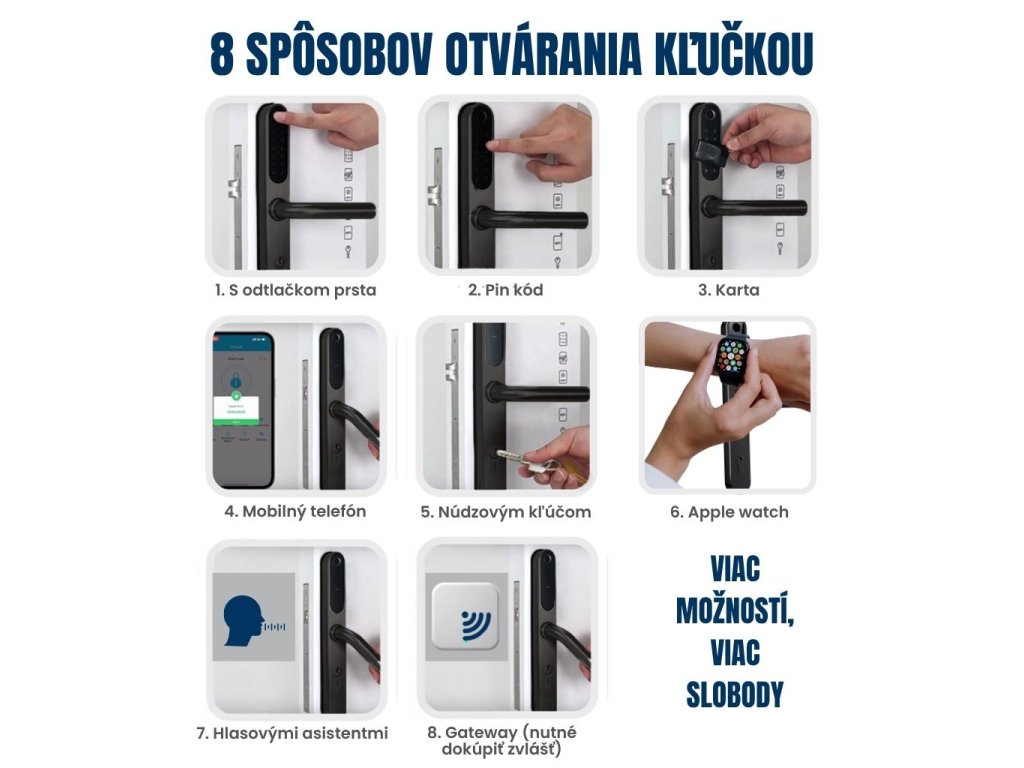 Bluetooth/WiFi inteligentná kľučka, vhodná pre interiérové aj exteriérové použitie , ovládanie cez aplikáciu TTlock , 8 možností odomykania (otlačok prsta, smartfón "Bluetooth", Apple Watch, Hlas "Alexa/Google", PIN kód, RFID karta, diaľkovo cez Wi-Fi alebo klasický kľúč), odporúčaná hrúbka dverí 35-75 mm (s predlžovacím setom až 120 mm), možnosť pravej aj ľavej orientácie, napájanie batériami 4ks AA, čierna