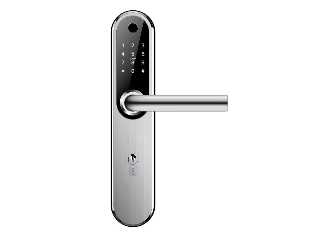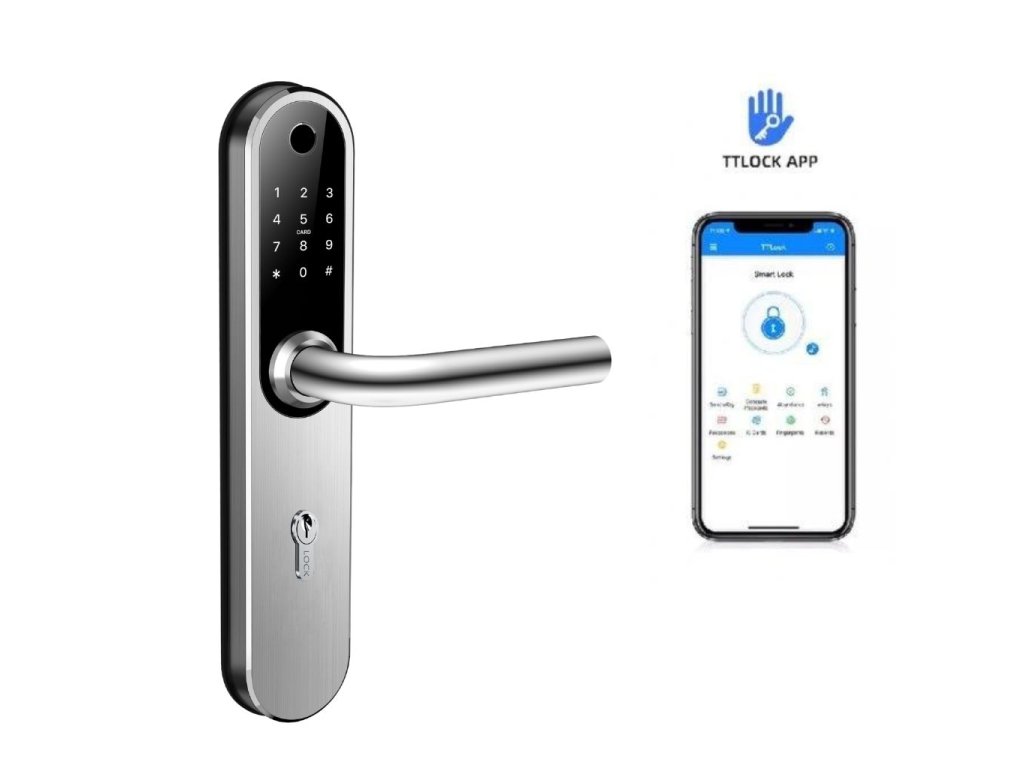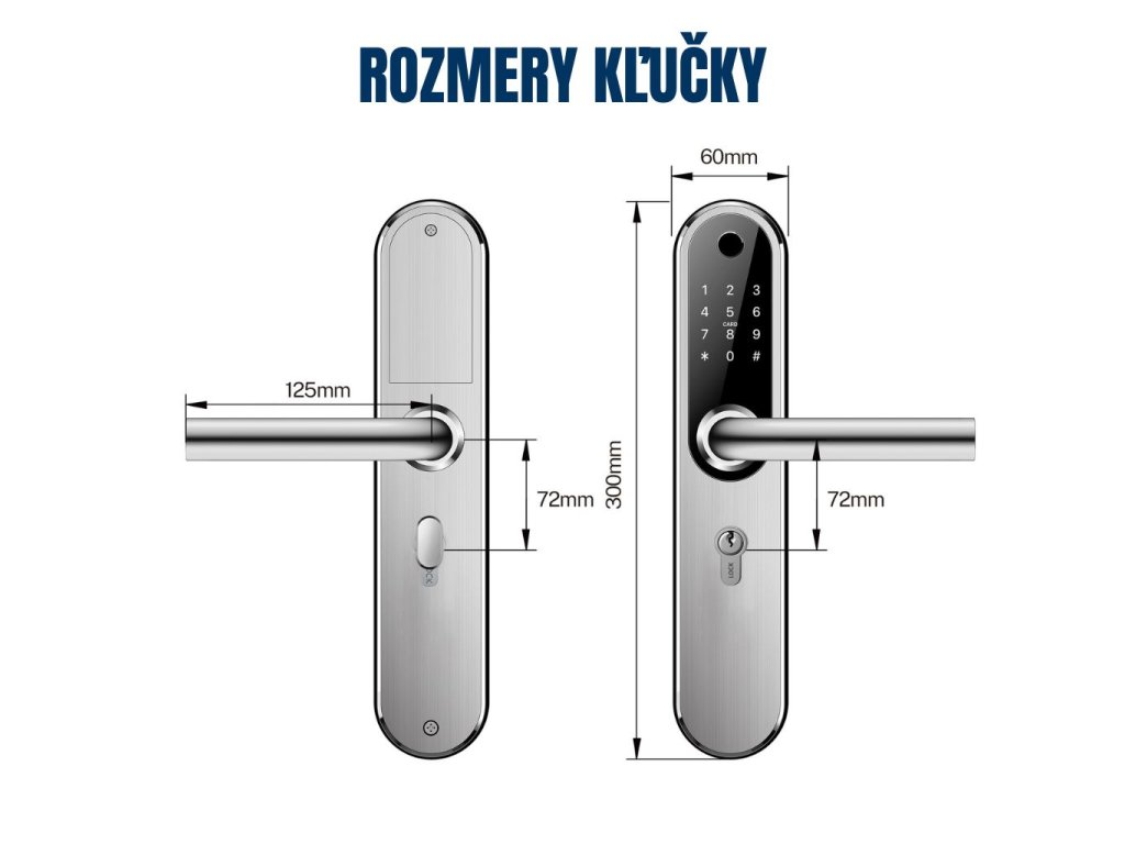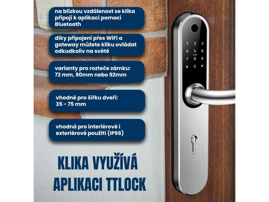 Bluetooth / WiFi inteligentná kľučka, vhodná na interiérové aj exteriérové použitie, ovládanie cez aplikáciu TTlock, 8 možností odomykania, varianty na rozteč zámku 72 mm alebo 92 mm, odporúčaná hrúbka dverí 35-75 mm (s predlžovacím setom až 120 mm), možnosť pravej aj ľavej orientácie, extra široký panel, napájanie batériami 4 ks AA, strieborná