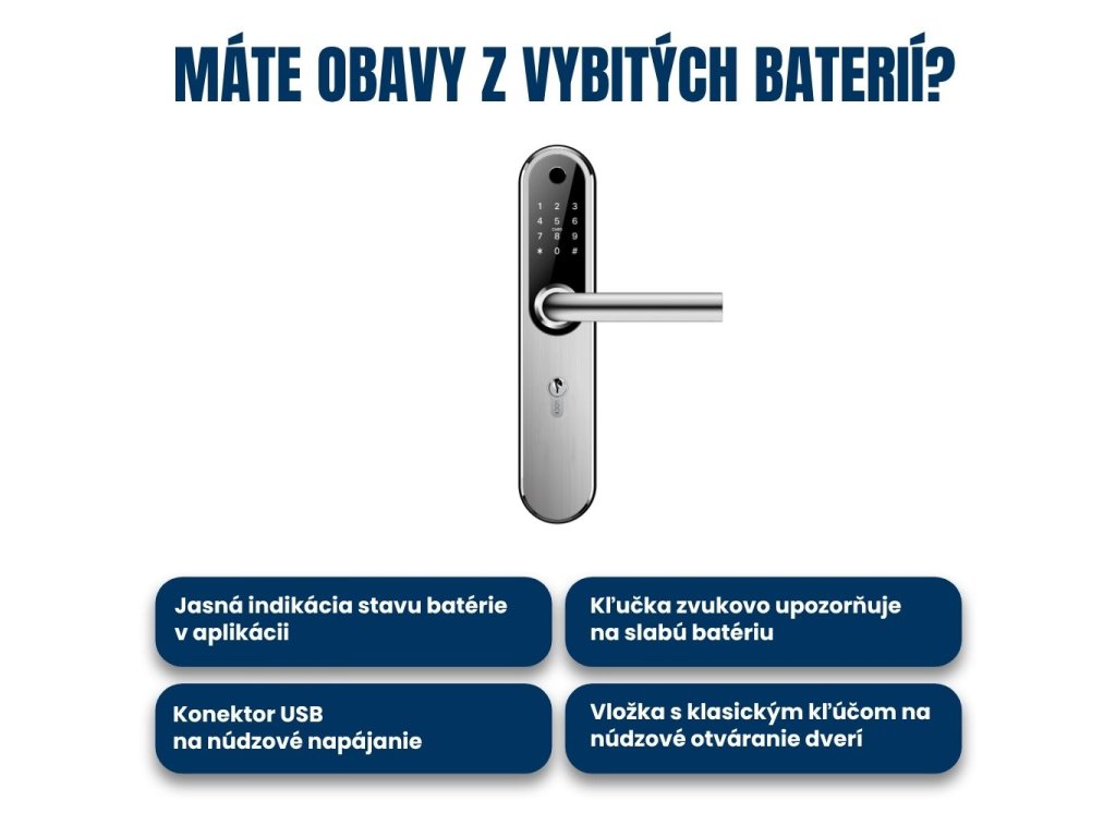 Kvalitné batérie vydržia v kľučke až 10 mesiacov pri odomykaní 20× denne. V aplikácii máte vždy prehľad o stave nabitia batérií. Ak by aj napriek tomu batérie skutočne došli, môžete otvoriť dvere klasickým kľúčom (v prípade, že máte nainštalovanú cylindrickú vložku) alebo kľučku jednoducho pripojiť cez USB napríklad k powerbanke či inému zdroju energie a dvere tak otvoriť.