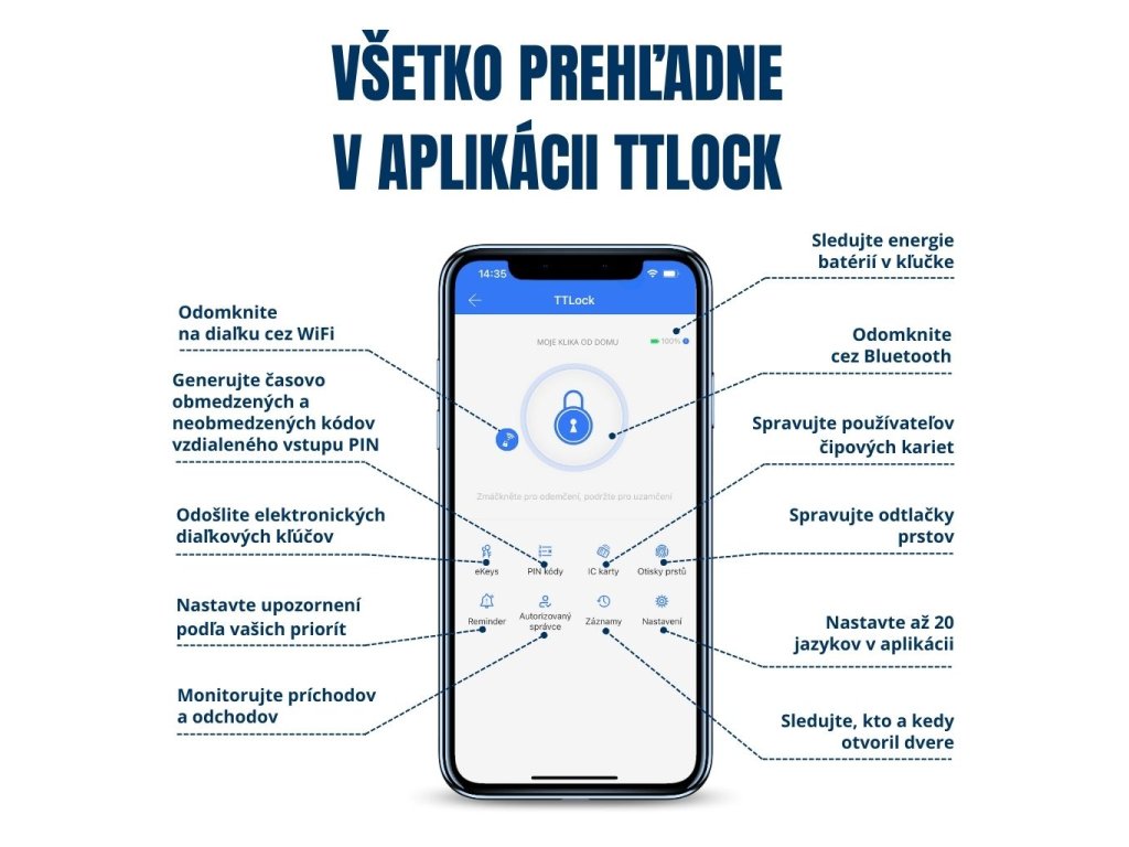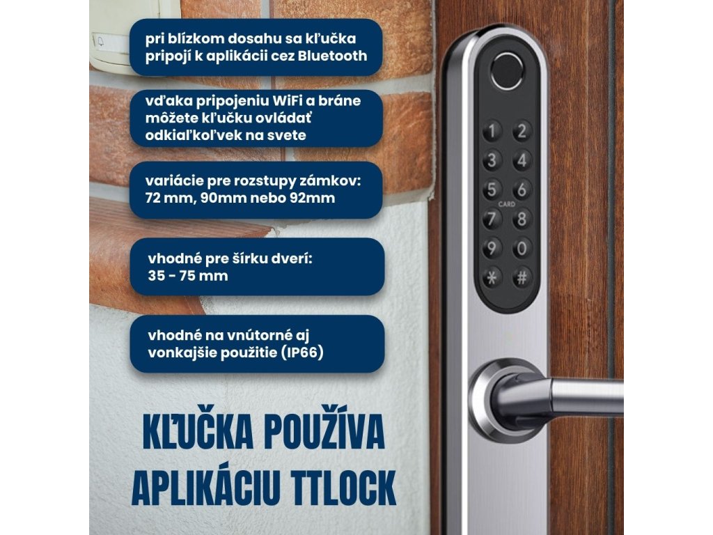 Kľučka využíva aplikáciu TTLock, ktorá je lídrom v oblasti inteligentných kľučiek a zámkov. Aplikácia ponúka špecifické varianty pre špecifické potreby - napr. vrátane inteligentného riadenia pre hotel, zabezpečenia domácnosti, dochádzky zamestnancov atď. (napr. varianty TTHotel alebo TTRenting). Je kompatibilná so službami Amazon Alexa a Google Home. V ponuke máme aj kľučky, ktoré využívajú na svoj chod aplikáciu TUYA a pre bežného užívateľa majú dostatok funkcií, avšak pre náročnejších užívateľov je vhodnejšia aplikácia TTLock. Kľučku s podporou aplikácie TUYA odporúčame hlavne zákazníkom, ktorí už majú časť svojej inteligentnej domácnosti postavenú na tejto aplikácii alebo v budúcnosti uvažujú o kúpe ďalších produktov s podporou jednej aplikácie. Aplikáciu, ktorú kľučka podporuje poznáte vždy z názvu kľučky.