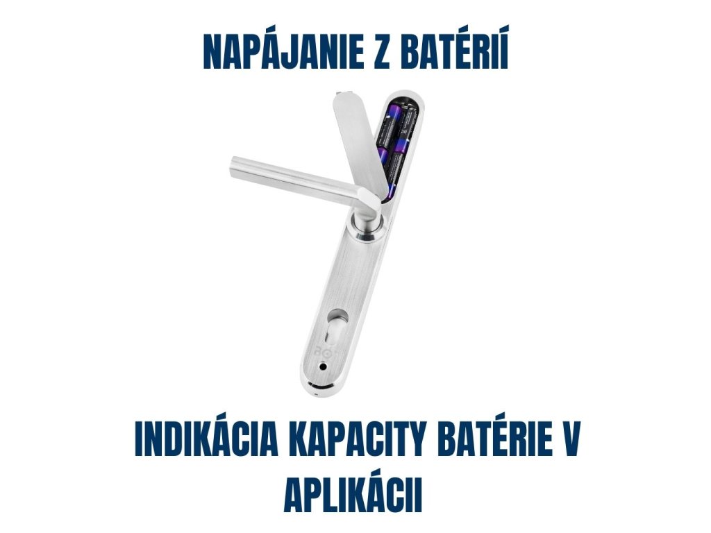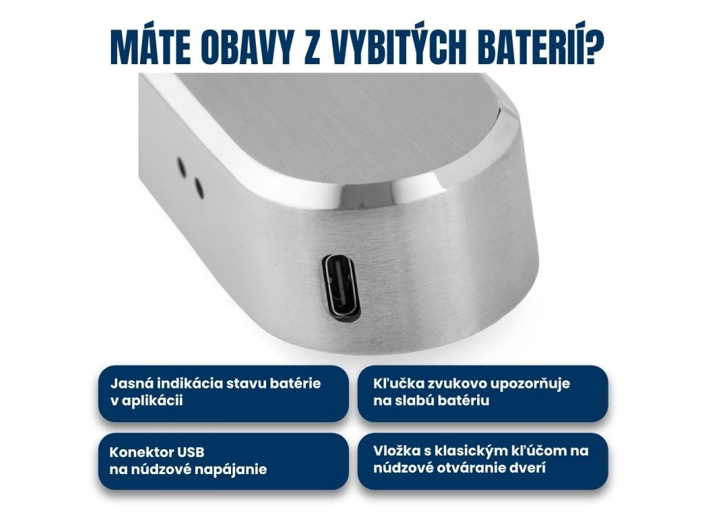 Vysokokvalitná batéria vydrží v kľučke až 10 mesiacov pri odomknutí 20-krát denne. Aplikácia vám vždy poskytne prehľad o stave nabitia batérie. Ak sa batérie skutočne vybijú, môžete dvere otvoriť klasickým kľúčom (pokiaľ máte nainštalovanú cylindrickú vložku) alebo jednoducho pripojiť kľučku cez UBS k powerbanke alebo inému zdroju energie a otvoriť dvere.