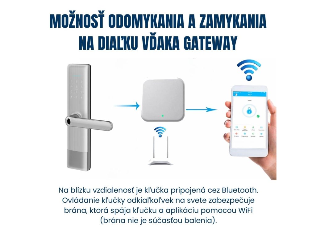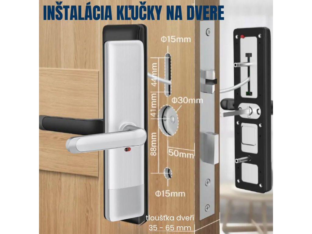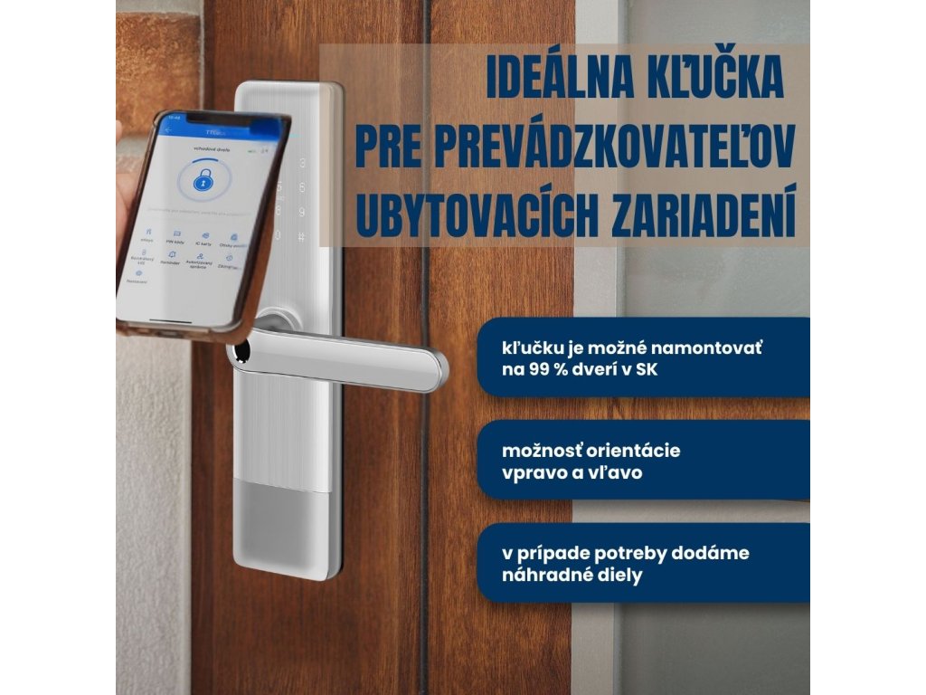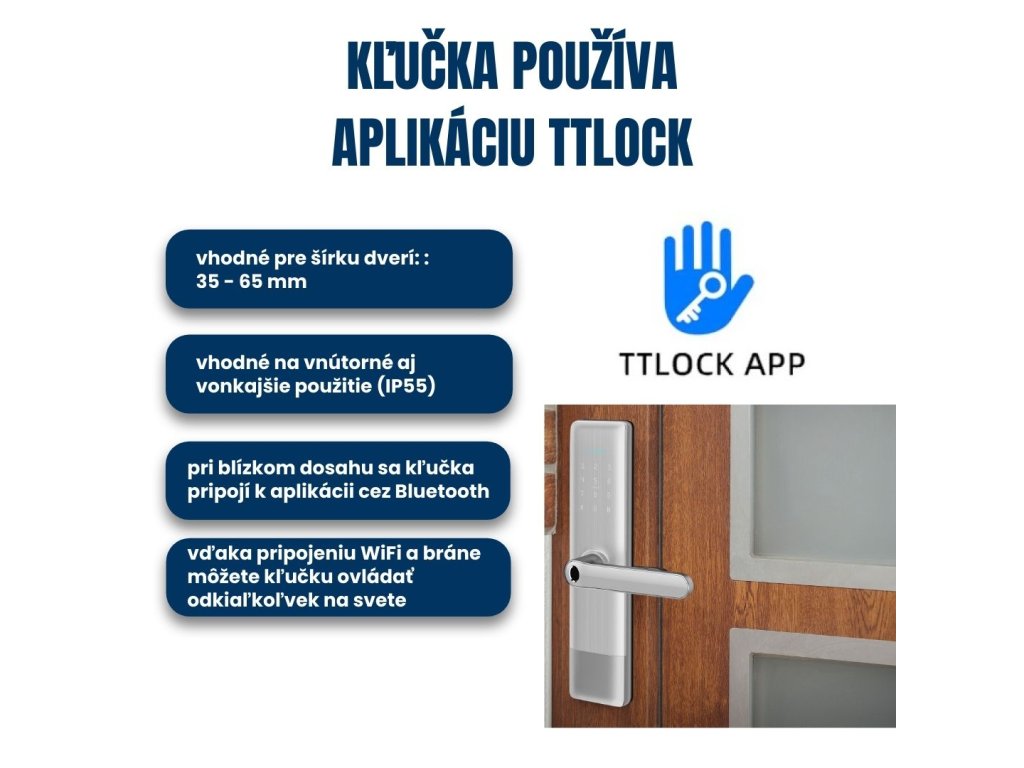 Bluetooth / WiFi inteligentná kľučka, vhodná pre interiérové dvere a ideálna pre hotely, penzióny a iné komerčné použitie. Nedá sa kombinovať s cylindrickou vložkou, ovládanie cez aplikáciu TTlock, 8 jednoduchých spôsobov odomykania: mobilom, PIN-om, odtlačkom prsta, čipom, pomocou Apple Watch, na diaľku cez gateway, hlasovými asistentmi alebo klasickým kľúčom, vhodná pre všetky bežné rozstupy zámkov, odporúčaná hrúbka dverí 35-65 mm