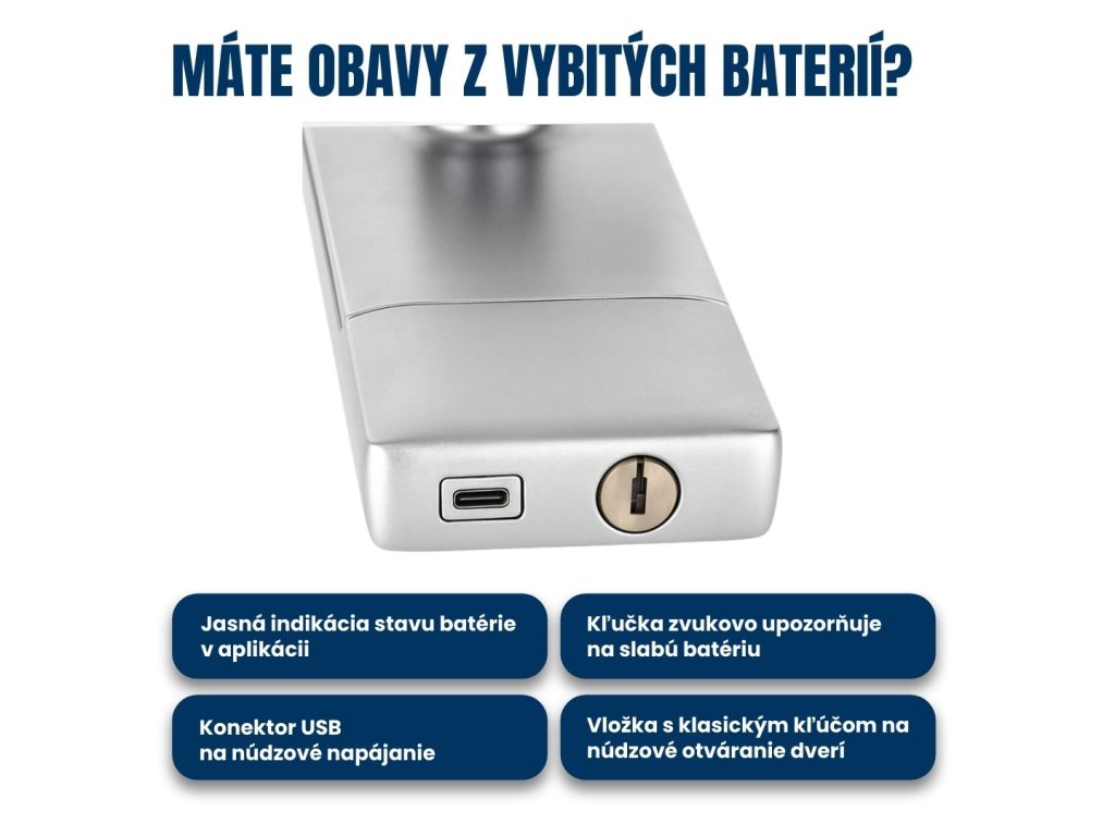 Vysokokvalitná batéria vydrží v rukoväti až 10 mesiacov pri odomknutí 20-krát denne. Aplikácia vám vždy poskytne prehľad o stave nabitia batérie. Ak sa batérie skutočne vybijú, môžete dvere otvoriť klasickým kľúčom (ak máte nainštalovanú cylindrickú vložku) alebo jednoducho pripojiť kľučku cez UBS k powerbanke alebo inému zdroju energie a otvoriť dvere.