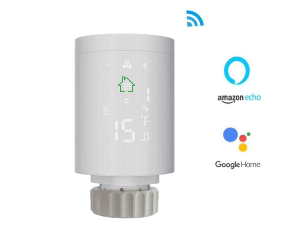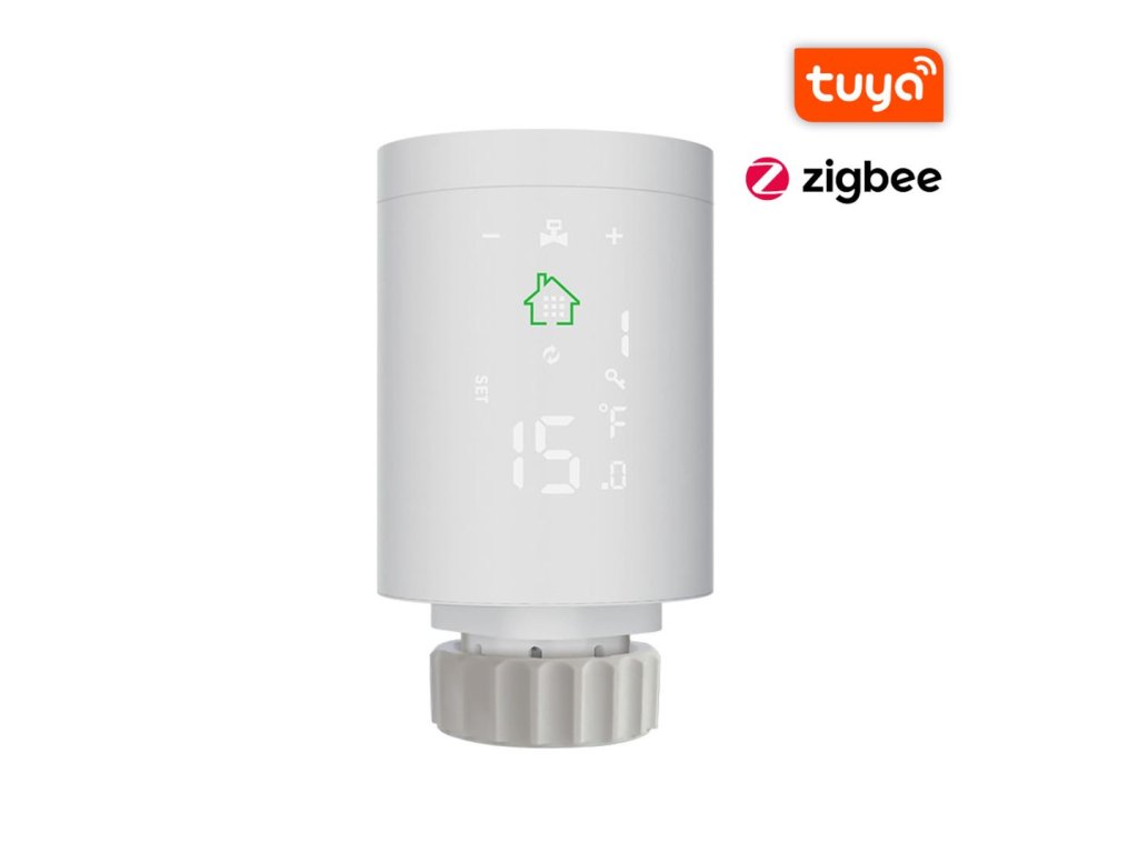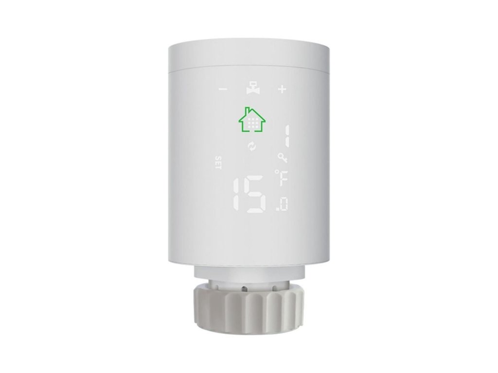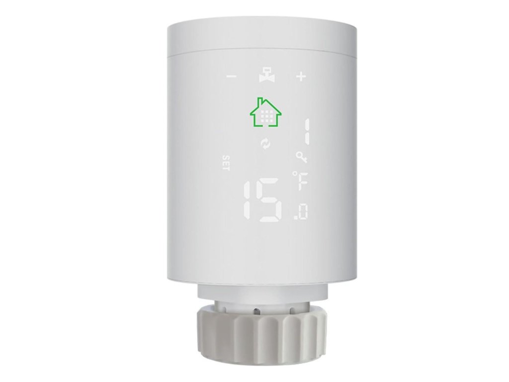 Inteligentná termostatická hlavica na ovládanie a monitorovanie vykurovania v dome, umiestnenie na radiátor, Zigbee, kompatibilná s Google Assistant a Amazon Alexa, napájanie z batérie, možnosť pripojenia k WiFi a prepojenia viacerých hlavíc pomocou WiFi brány (treba zakúpiť samostatne), farba biela.