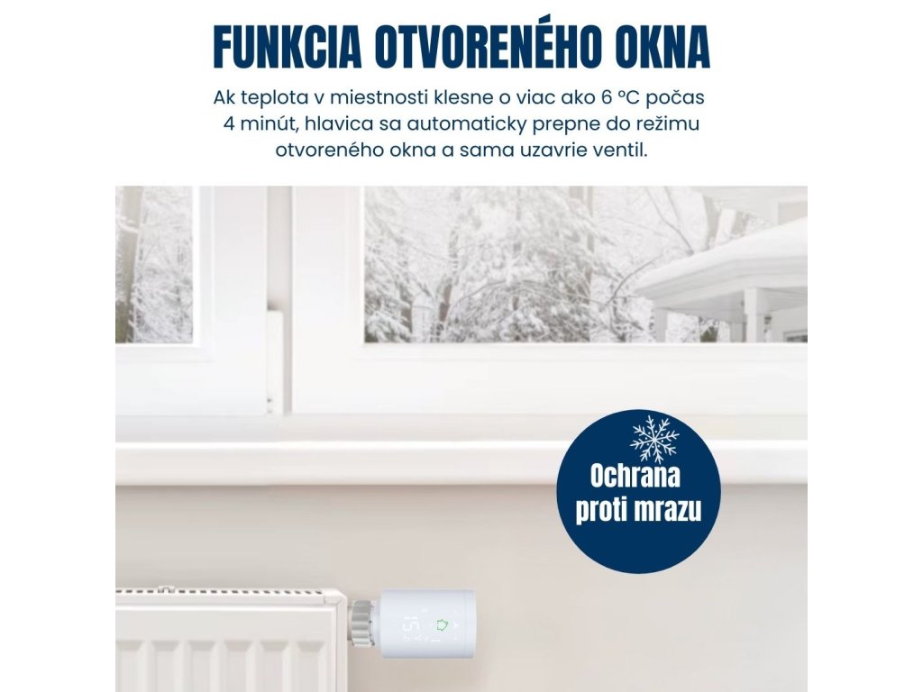 Hlavica nemá samostatné čidlo okna. Funguje na princípe rýchleho poklesu teploty: