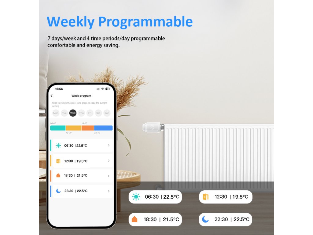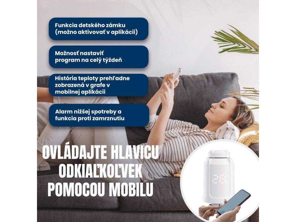 Inteligentná termostatická hlavica ovláda vykurovanie domácnosti a optimalizuje spotrebu energie. Bola vytvorená na používanie so smartfónmi. Kedykoľvek a odkiaľkoľvek tak môžete kontrolovať a upravovať vykurovanie domácnosti zo svojho smartfónu v rozsahu teplôt od 5 do 35 °C, s odchýlkou 0,5 °C.