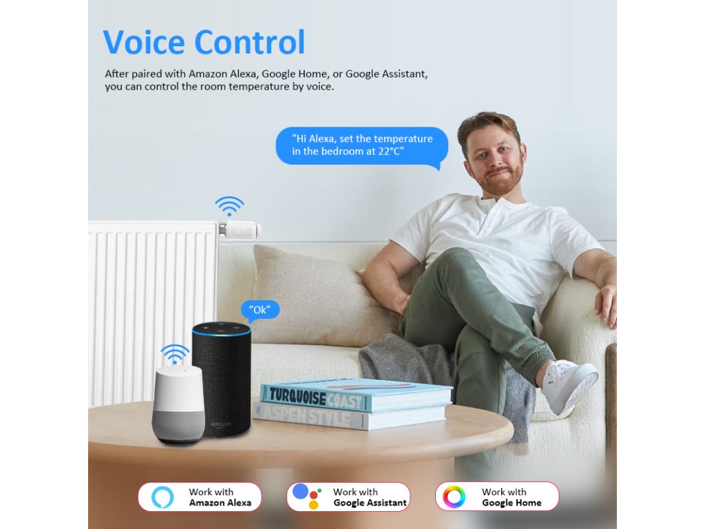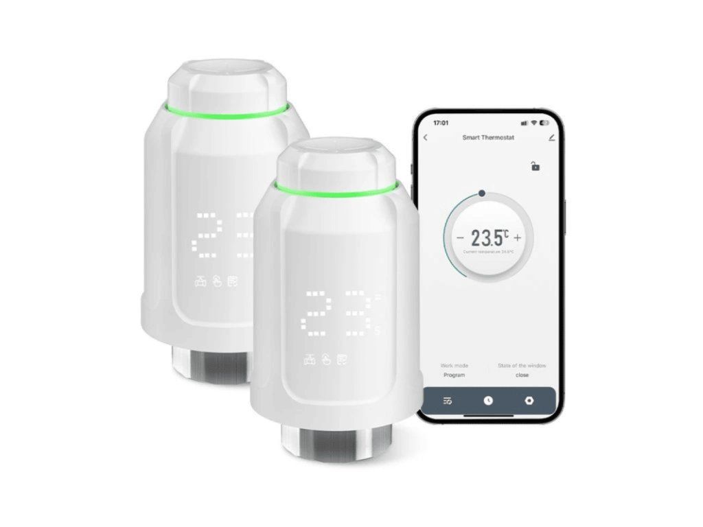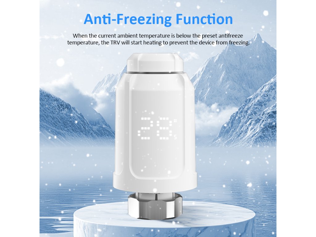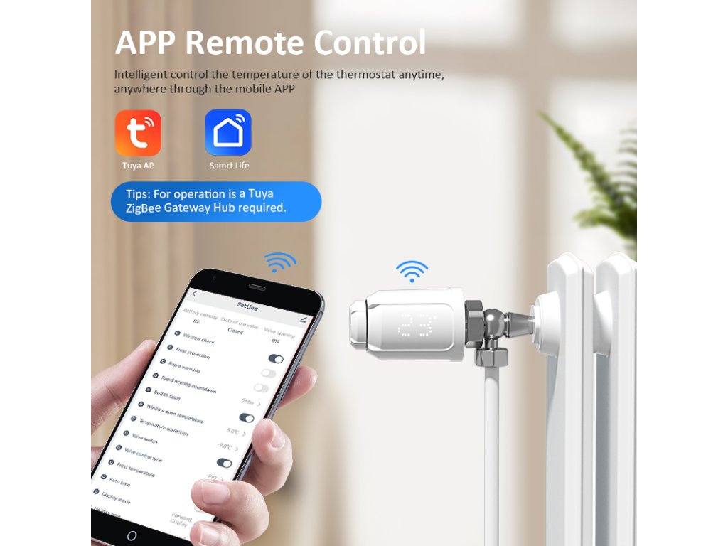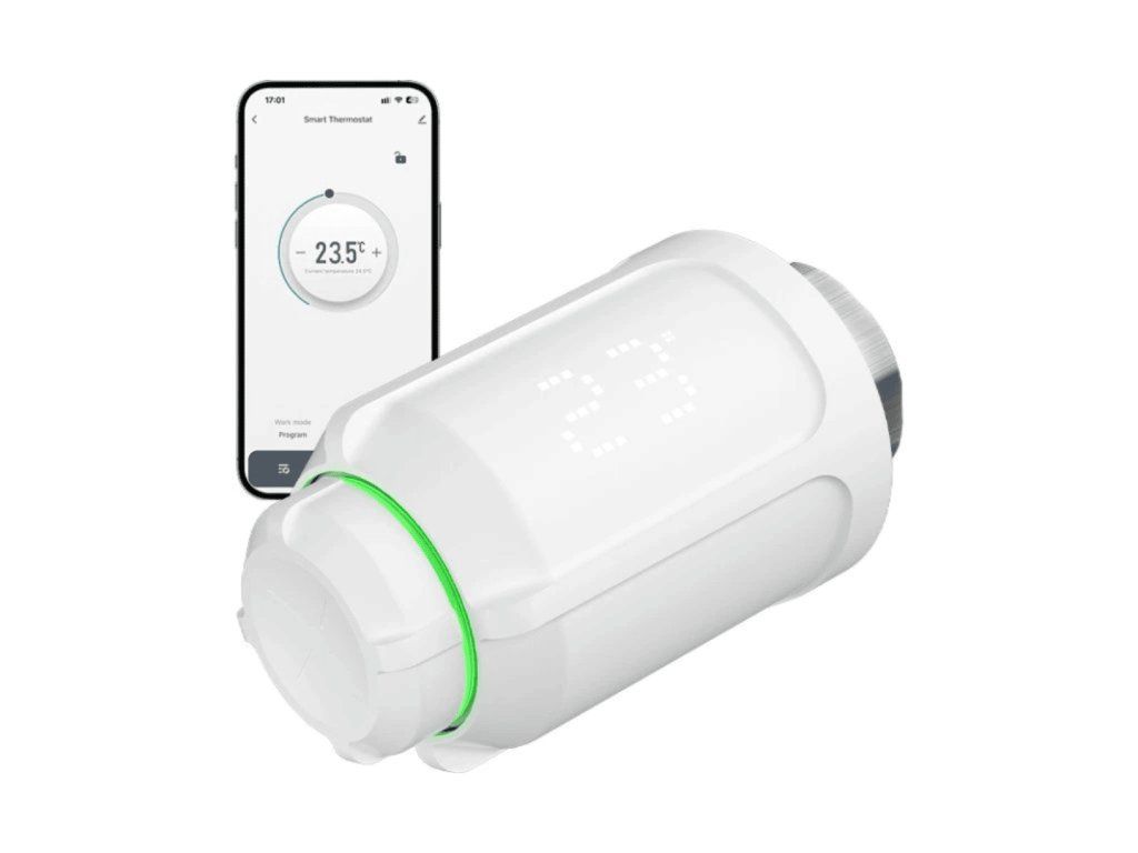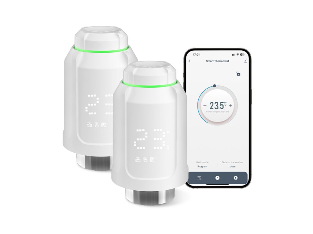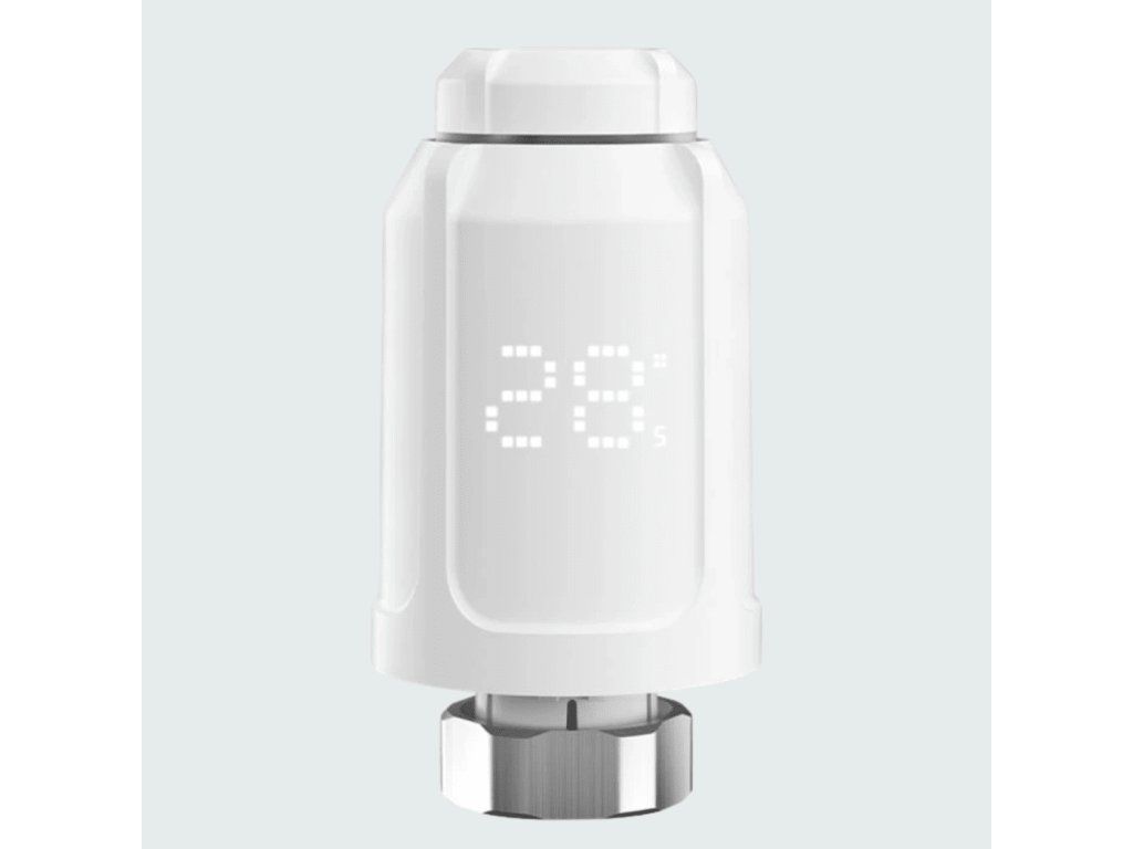 Inteligentná termostatická hlavica na ovládanie a kontrolu vykurovania v dome, určená na montáž na radiátor, Zigbee, kompatibilná s Google Assistant a Amazon Alexa, napájaná batériami, možnosť pripojenia na WiFi a prepojenia viacerých hlavíc pomocou WiFi gateway (je potrebné dokúpiť samostatne), farba biela.
