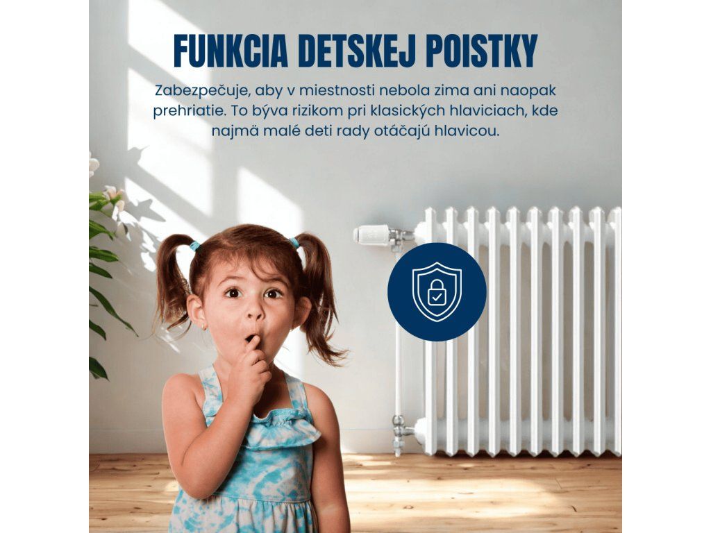 O tom, že programované a inteligentné vykurovanie miestností v čase ušetrí nemalé finančné prostriedky, niet pochýb. Trávite veľa času na stretnutiach a v kancelárii bývate nepravidelne a skôr minimálne? Inteligentná termostatická hlavica umožní ovládať vykurovanie na diaľku. Už sa vám nestane, že zabudnete znížiť teplotu pri odchode a naopak pri príchode nemusíte čakať, kým sa priestory vyhrejú. Teplotu nastavíte pohodlne odkiaľkoľvek na diaľku. Rovnako môžete pomocou termostatických hlavíc ovládať teplotu v byte pri odchode do práce alebo napríklad pri odchode na dovolenku. Integrovaná detská poistka zabezpečí, že zásahom malých detí nebude v miestnosti chlad alebo naopak prehriatie. To býva rizikom pri klasických hlaviciach, keď najmä malé deti rady otáčajú hlavicou sem a tam v rámci hry.