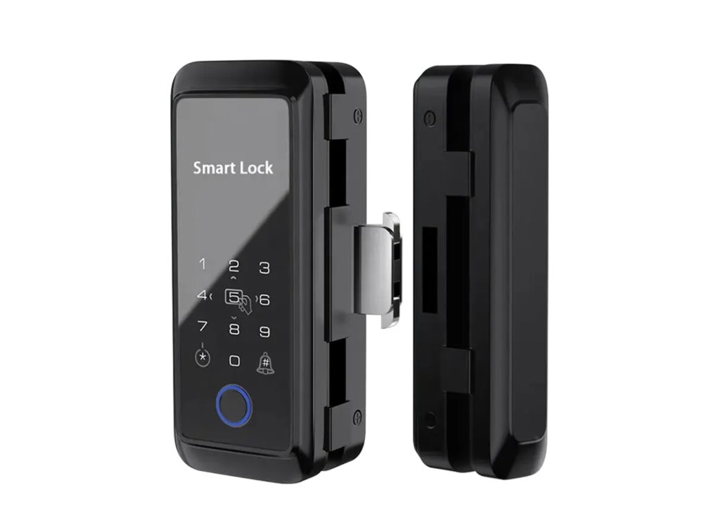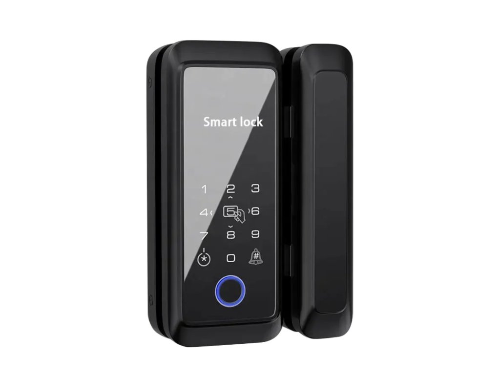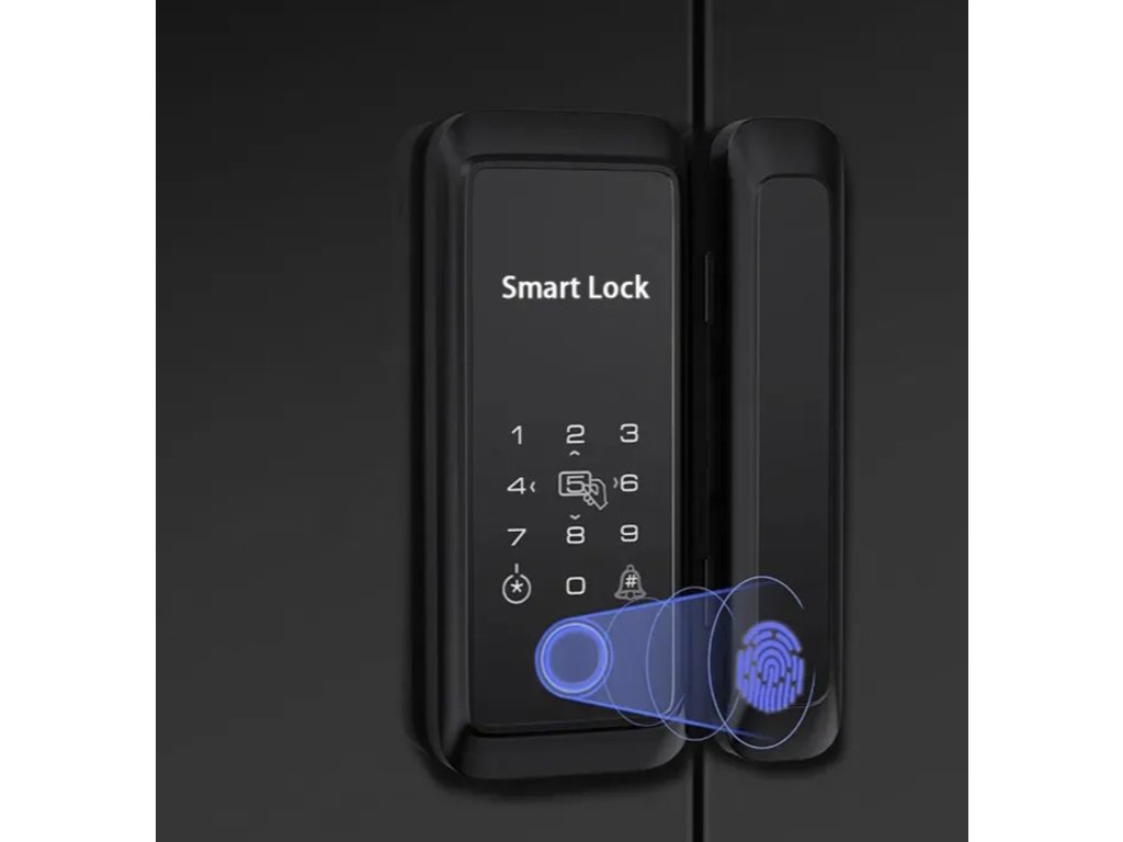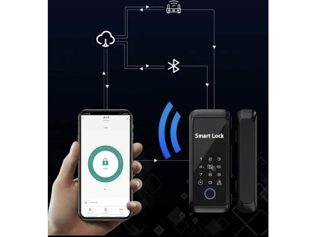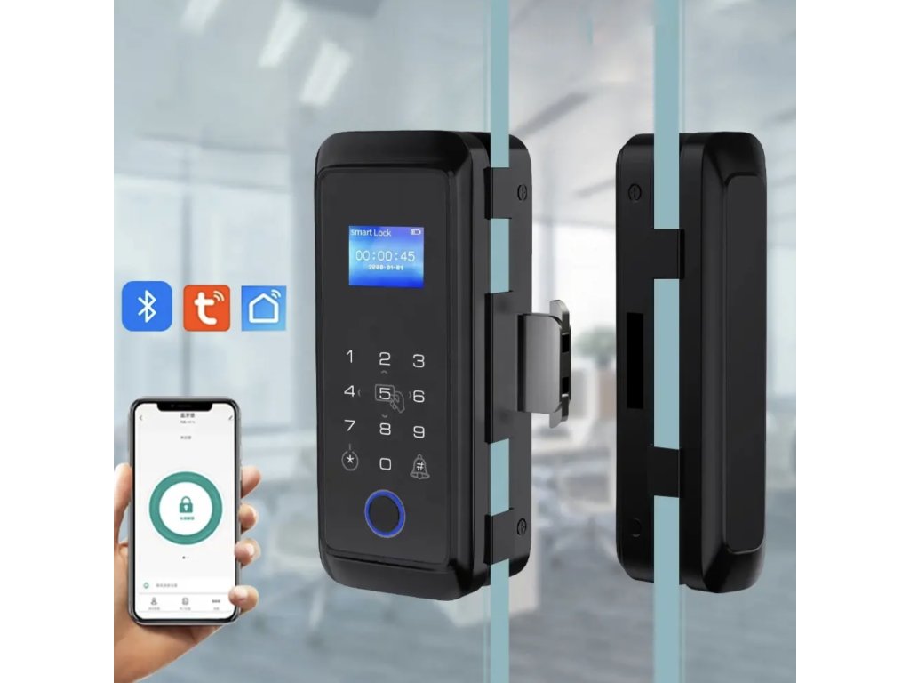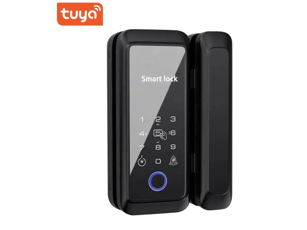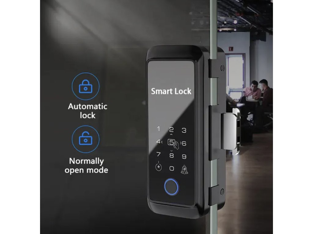 Inteligentný dverný zámok, vhodný pre sklenené dvere, Bluetooth, WiFi, ovládanie cez mobilnú aplikáciu Tuya, napájanie z batérie, 4 možnosti odomykania, čierna farba.