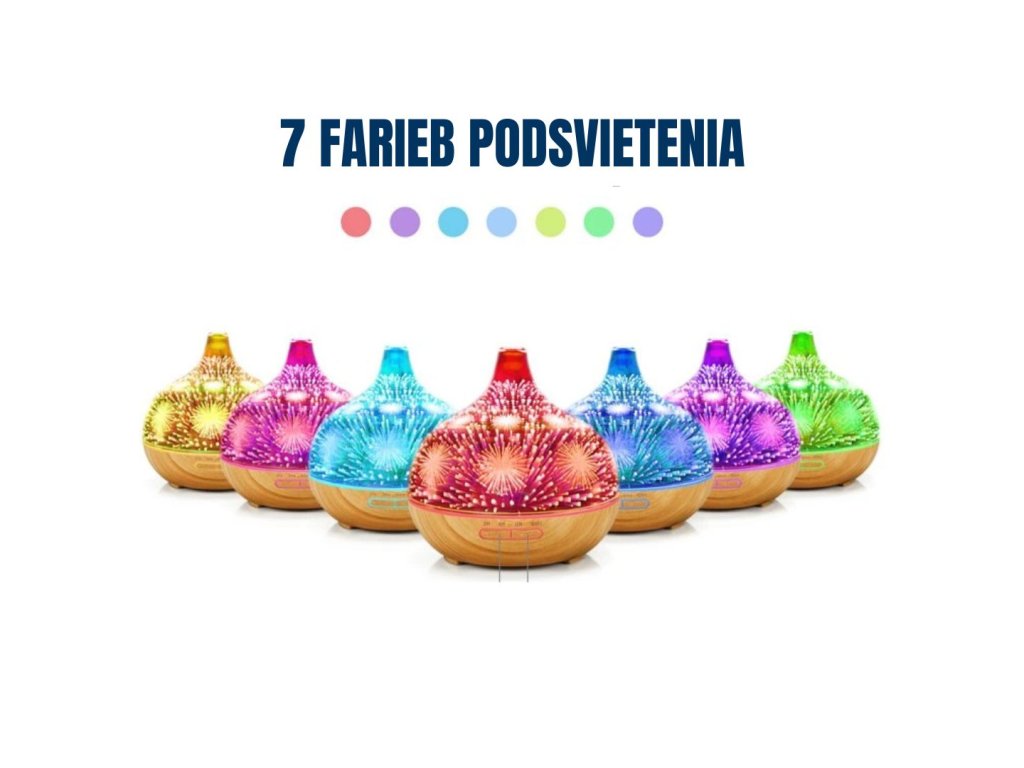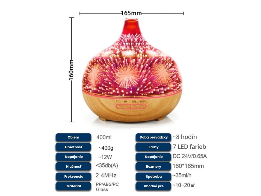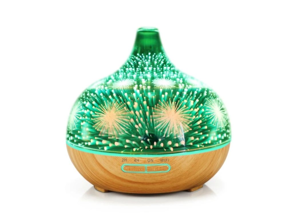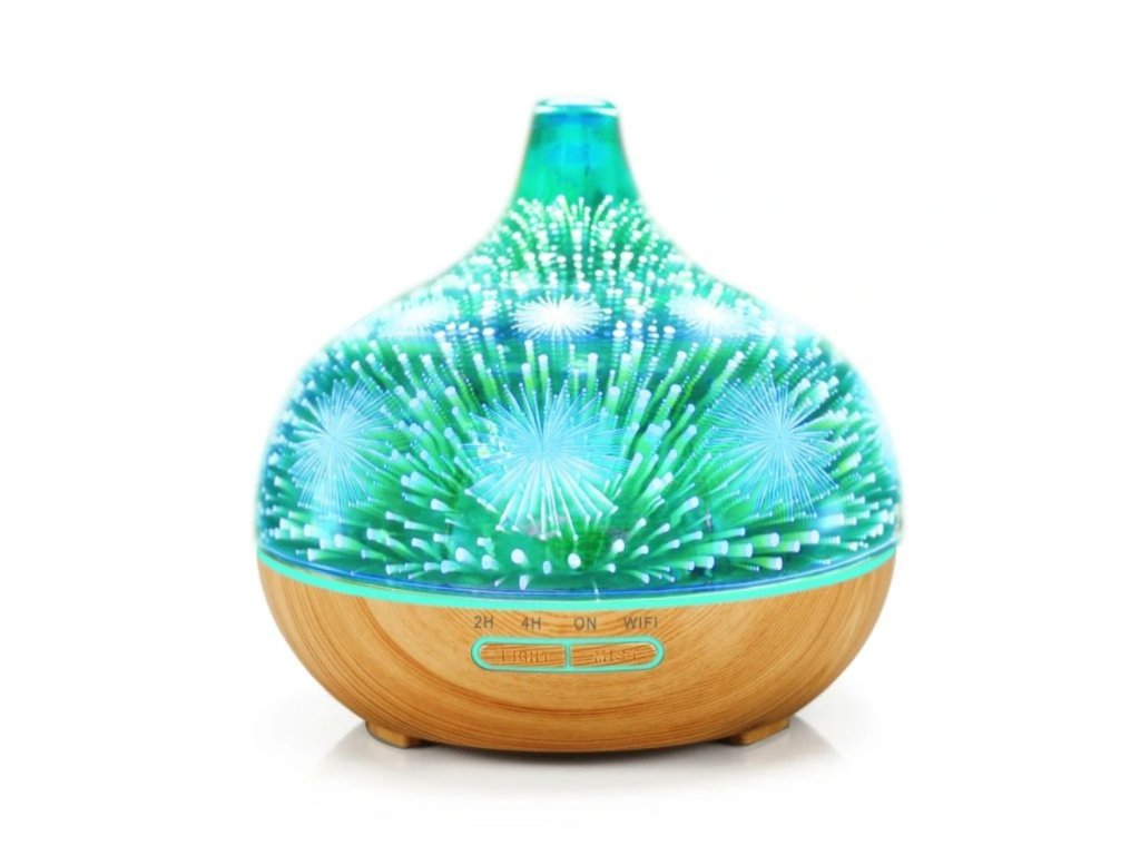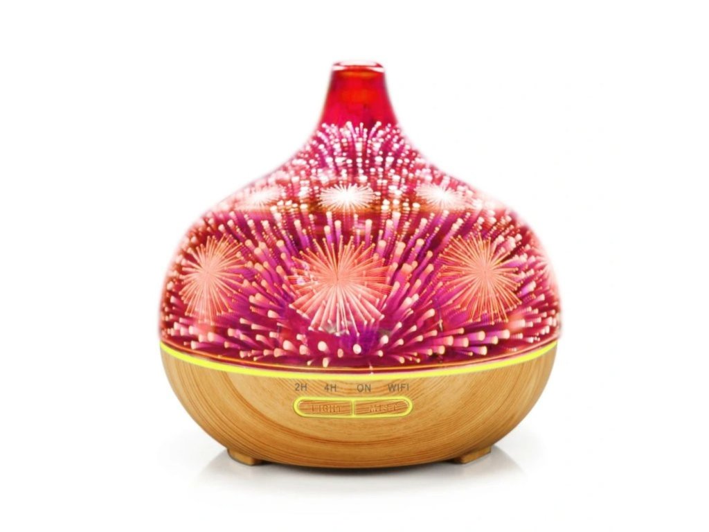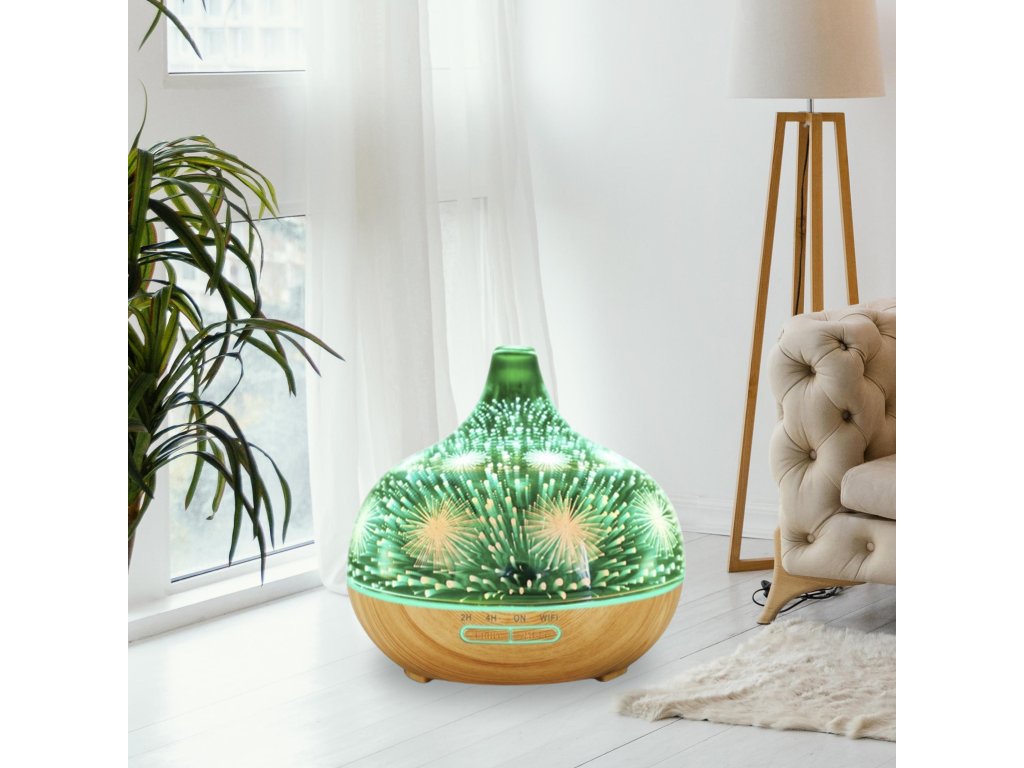 Chytrá aróma difuzér, objem nádoby 400 ml, 7 farieb podsvietenia, doba prevádzky 6-8 hodín na jednu náplň, WIFI, podsvietenie a časovanie vypnutia a zapnutia, farba: svetlé drevo a ohňostroj s LED podsvietením.