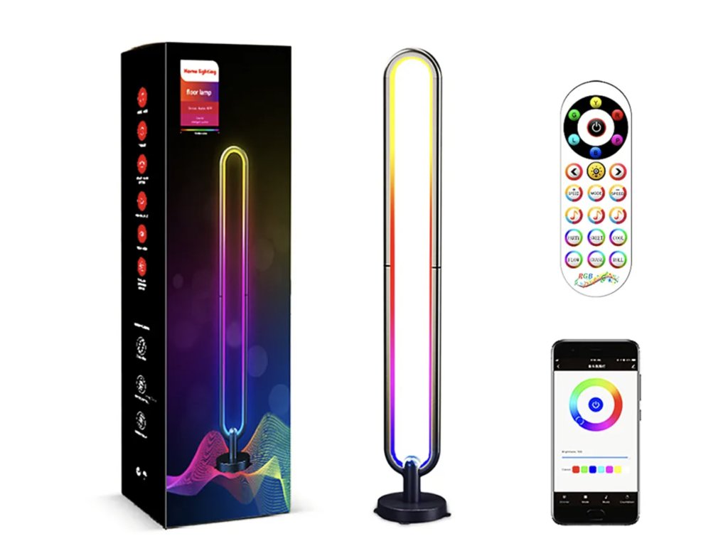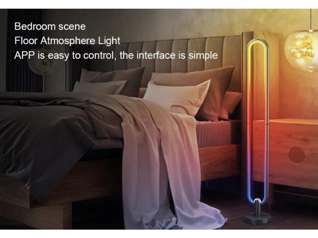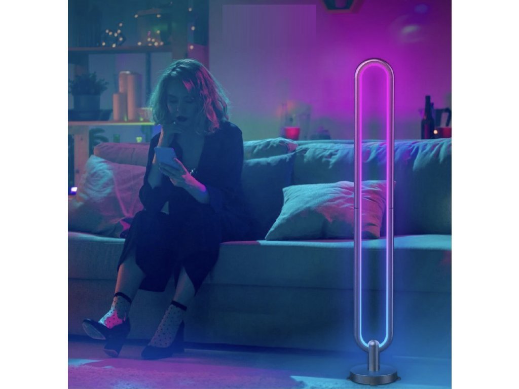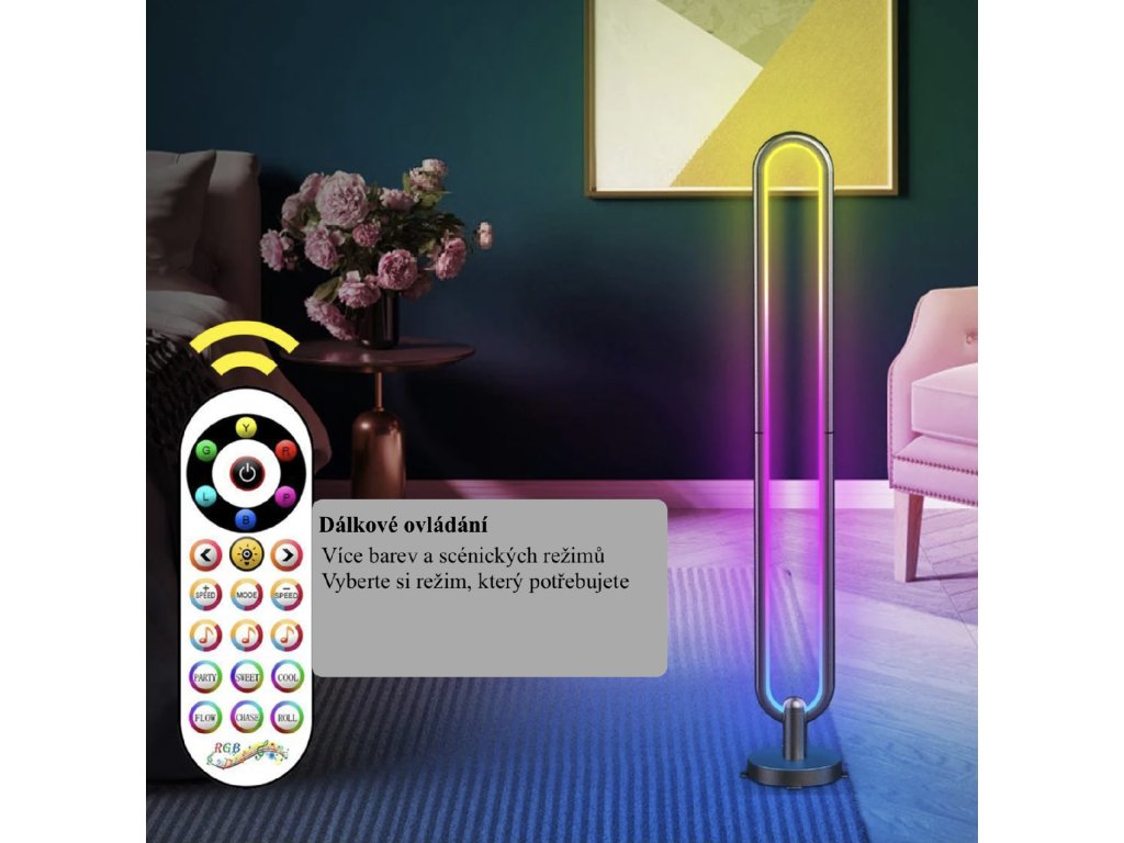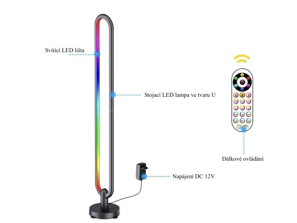 Inteligentná LED stojacia lampa, WiFi, Bluetooth, tvar U, 16 miliónov farieb, stmievateľná, diaľkové ovládanie, 120 LED žiaroviek, príkon 18 W, mobilná aplikácia Smart Life, rozsah teploty farieb 3000-6000 K, zabudovaný mikrofón, čierna farba.