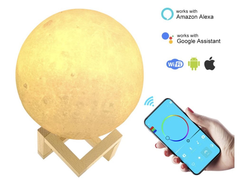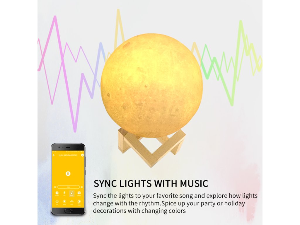 Stolná lampa Moon WiFi CR03 je pekná miniatúra mesiaca s možnosťou výberu zo 16 miliónov farieb pomocou mobilnej aplikácie. Lampa je 3D replikou Mesiaca a okrúhla lampa je vymodelovaná s rôznymi krátermi. Je vyrobená z ekologického materiálu a jej okrúhly tvar vyzerá veľmi štýlovo. Súčasťou balenia je drevený stojan, na ktorý môžete lampu umiestniť, aby krásne ladila s vaším interiérom. Svietidlo sa ľahko dobíja pomocou priloženého kábla USB. Tento výrobok je skvelou voľbou pre každého, kto si doma rád vytvára príjemnú atmosféru, či už pri práci, alebo pri relaxácii.