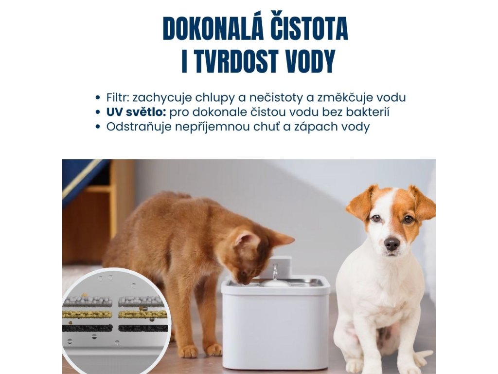 Fontána pre mačky a psy, objem 4 litre, UV filter pre vodu bez baktérií, vymeniteľný filter s aktívnym uhlím, vyrobená z nehrdzavejúcej ocele a plastu.